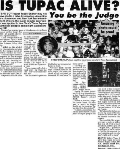 75)Not only am I not the only person who believed Pac is alive, polls actually show that 2 times the people believe Pac is alive, then that who believe he is dead. Reports of him being alive have been in various newspapers around the country. And also on television. Fox news did a segment, and also CNN. Believe it or not, so has MTV.